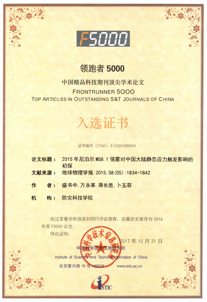 2017年中国科学技术信息研究所公布的2016年度“领跑者5000——中国精品科技期刊顶尖学术论文(F5000)”,我系盛书中副教授为第一作者撰写发表的“2015年尼泊尔MS8.1强震对中国大陆静态应力触发影响的初探”论文入选,该论文发表在《地球物理学报》(2015年第58期)上,论文的资助项目为中国地震局教师基金项目(20140102) 、中央高校基本科研业务专项资金(创新项目团队资助计划) (ZY20110101) 和国家国际科技合作专项项目(2012DFG20510)。该论文为新葡官网第一篇入选F5000(即领跑者5000)的学术论文,入选F5000的论文需经过定量分析遴选和同行评议推荐。该文能够入选,说明其内容科学、严谨,反映该研究具有一定的创新性和较高的学术水平。
