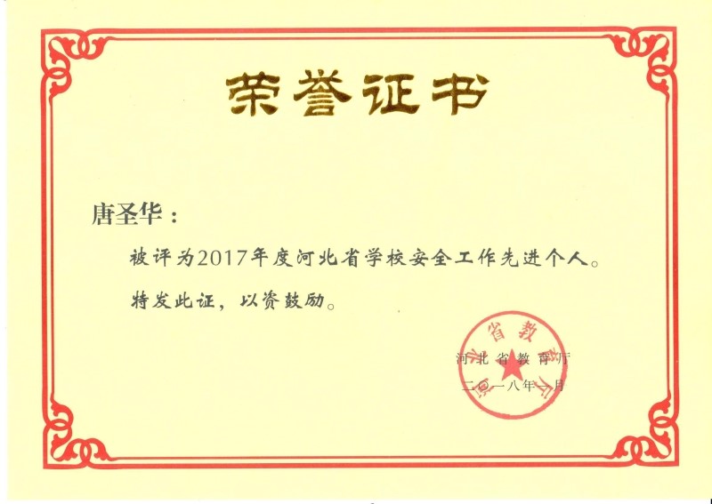 1月11日,河北省教育厅在保定市召开2018年全省学校安全稳定工作会议,总结部署全省学校安全工作,表彰2017年度河北省学校安全工作先进集体和个人。新葡官网地震科学系辅导员唐圣华获得“2017年度河北省学校安全工作先进个人”称号。