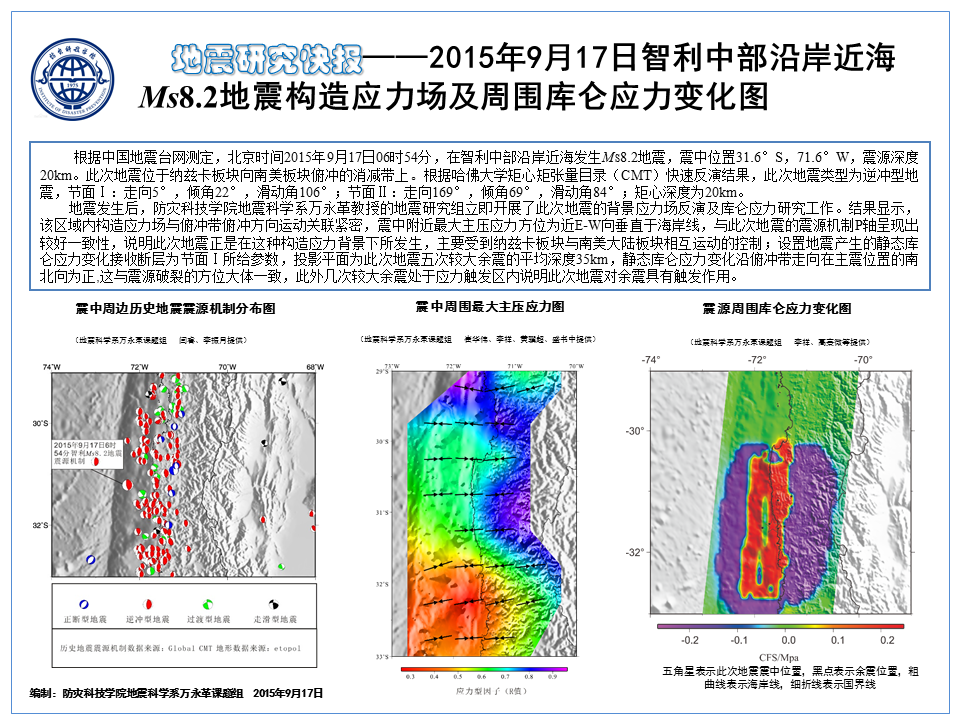 智利中部沿岸近海Ms8.2地震构造应力场及周围库仑应力变化图