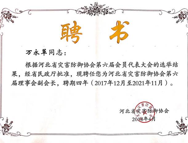 根据河北省灾害防御协会第六届会员代表大会的选举结果,经河北省民政厅批准,聘任新葡官网万永革教授为河北省灾害防御协会第六届理事会副会长,聘期四年(2017年12月至2021年11月)。(撰稿:黄骥超)