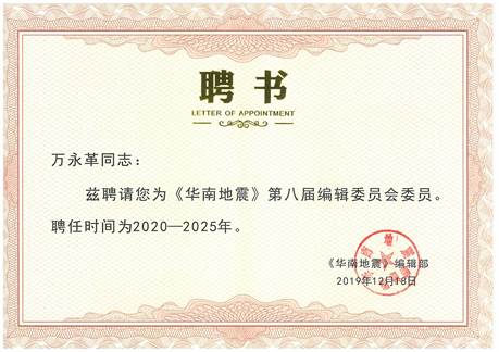日前,新葡官网万永革研究员受聘为《华南地震》第八届编辑委员会委员,聘任时间为2020—2025年。