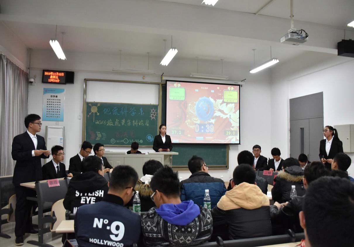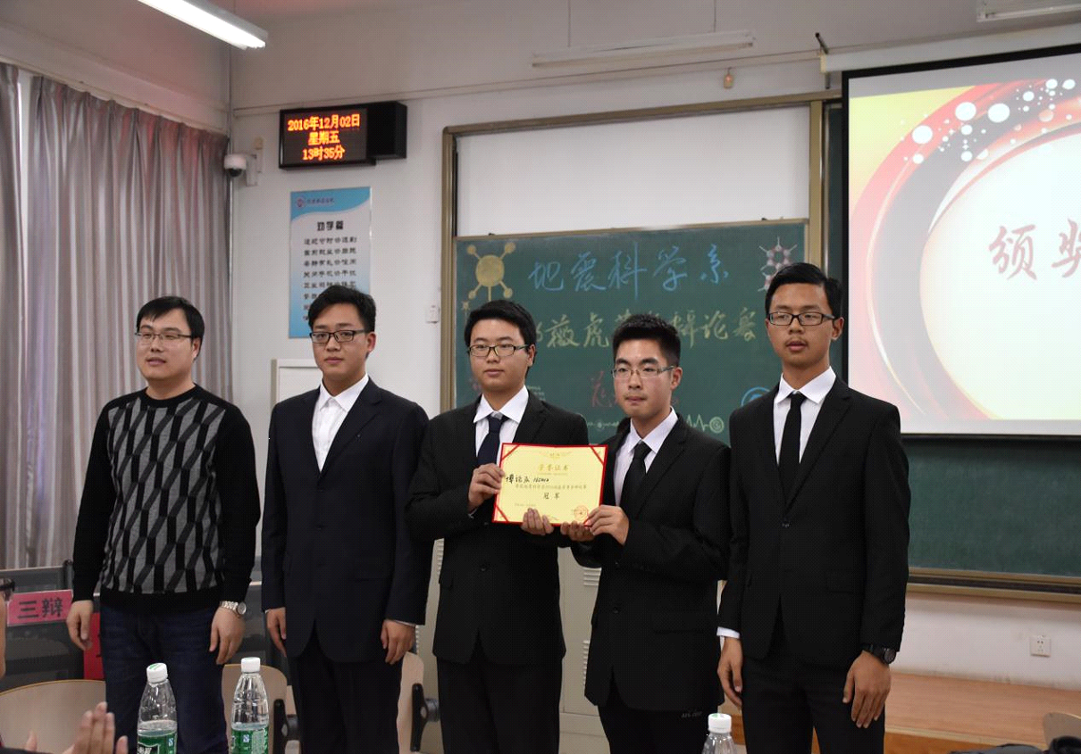 2016年12月2日中午,由地震科学系学生会和地震科学系辩论爱好者协会共同举办的2016级薇虎黄金辩论赛决赛在北校实验楼335教室正式拉开帷幕。地震科学系团总支书记唐圣华老师、地震科学系份辅导员牛晓龙老师、地震科学系团学生会主席团们以及防灾工程系学生会主席团们担任本次比赛的评委,出席本次比赛的嘉宾有:地震科学系团总支学生会各部部长及副部长、地震科学系辩论队成员。