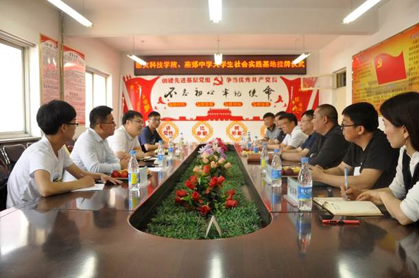 仪式开始前,双方在亲切友好的氛围中进行了座谈。燕郊中学校长梁立民和3003新葡平台党总支书记唐圣华分别介绍了两校的建校历史、办学特色和发展成就,双方就建立大学生社会实践基地、搭建两校社会实践交流平台、拓展社会实践合作领域、提升学生综合素质等方面进行了深入的交流,达成了共识,为进一步加强两校在社会实践领域的交流合作奠定了坚实基础。
