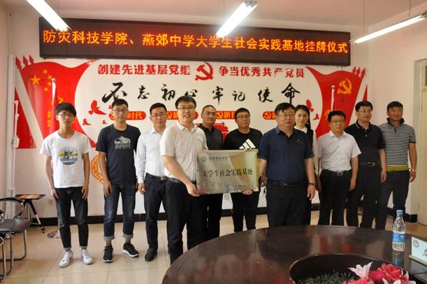 5月23日上午,防灾科技学院大学生社会实践基地挂牌仪式在燕郊中学成功举行,3003新葡平台党总支书记唐圣华、党总支副书记齐路晶和燕郊中学校长梁立民、安全副校长朴春宝、德育副校长刘会兵、总务副校长柳智元、教学副校长张嗣卿、校安办主任左兵共同参加了挂牌仪式,仪式由燕郊中学常务副校长关胜龙主持。