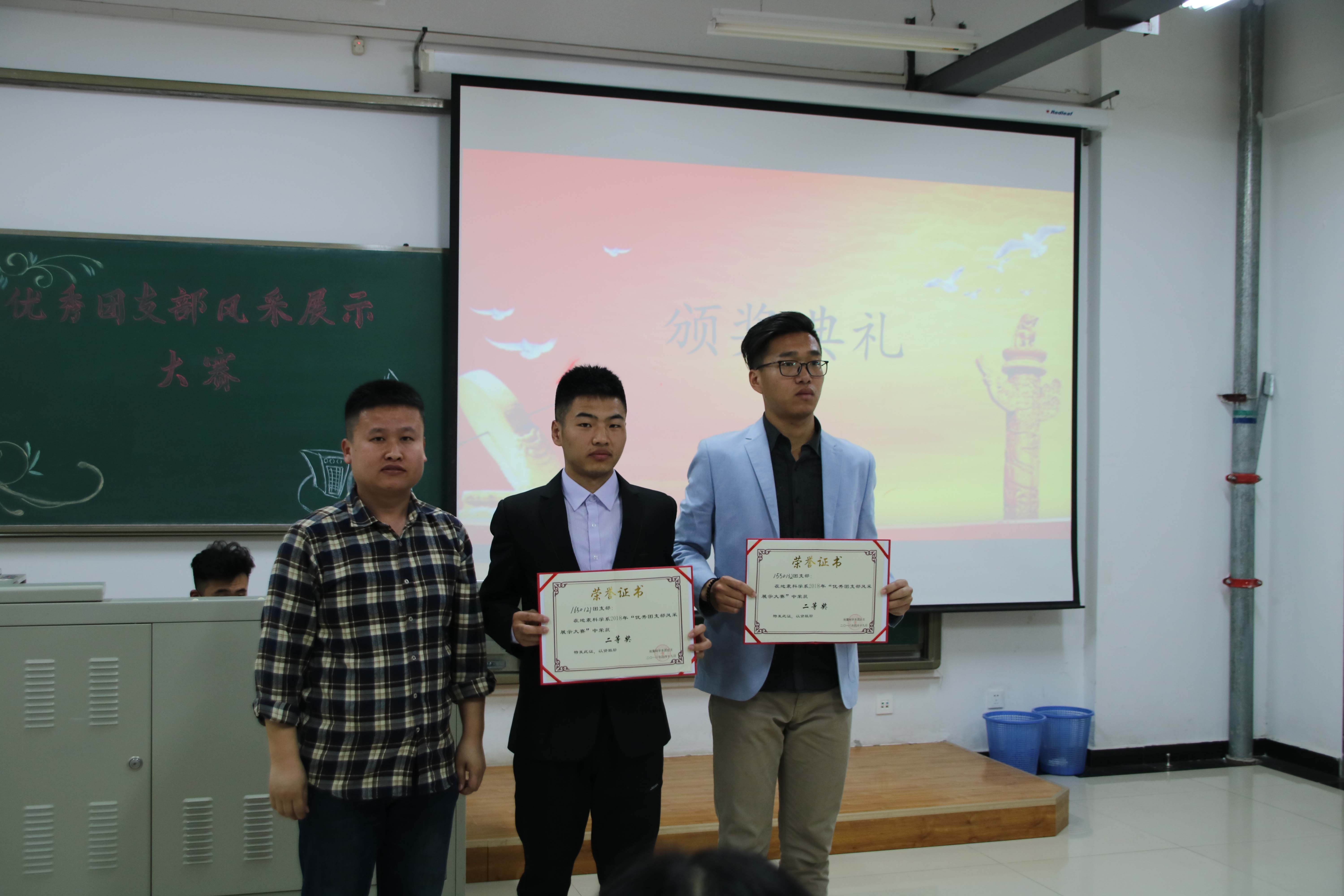 主持人开场后首先介绍了到场的嘉宾,之后宣布大赛开始。首先前四个团支部依次汇报展示,然后候钟溢同学演奏吉他《花之舞》,之后主持人宣布前四个团支部的得分,接下来四个团支部汇报展示,然后由张云皓和郝时捷同学带来朗诵《中国梦》,之后三个团支部进行汇报展示,然后由吴尚坤等六位同学合唱歌曲《朋友》,场内老师和同学们也一起跟随音乐节拍拍手并合唱,活动氛围团结而美好,最后三个团支部汇报展示后,播放了其余未到场团支部的风采展示视频。之后唐圣华老师为本次大赛进行点评,并对各团支部的优秀风采表示肯定。最后由主持人宣布获奖情况,并请老师为获奖团支部颁奖,获奖情况如下:
