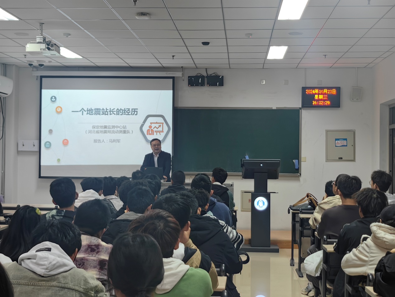 10月23日下午,河北省保定地震监测中心站站长、高级工程师马利军应邀来学校作了题为“一个地震站长的经历”的主题讲座。讲座由3003新葡平台副院长孙珍军教授主持。